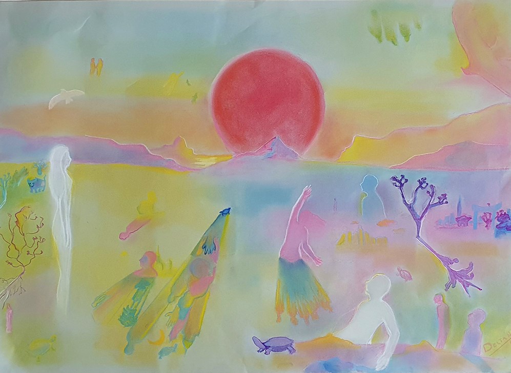 Paired in art and life, Delta N.A. work simultaneously on each artwork with a shared language that reveals deep meanings and speaks directly to the heart. Timeless stories develop in each artwork, where figures and forms are placed in a subtle and ethereal space halfway between dream and reality and where the soft flow of emotions and intuitions collects the sense of a free and introspective existence.