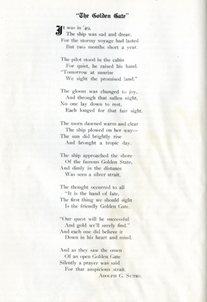 The 1910 issue of Ignatian included a poem dedicated to the Golden Gate. Depicting California history, this poem is one of many in which college students show their love for the Bay Area. From USF Yearbooks Collection.